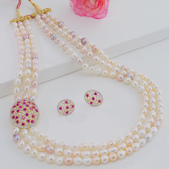Bring vibrance and charm to your collection with this beautiful necklace set, featuring freshwater cultured pearls in a graceful drop shape (A-grade quality). The three-row, 20-inch design showcases a captivating blend of multicolor pearls, radiating elegance from every angle. A bold red stone centerpiece adds a touch of sophistication, creating the perfect harmony between tradition and modern style. Backed by a life-long guarantee on pearls, this versatile set is ideal for weddings, festive occasions, and cultural celebrations, pairing effortlessly with everything from grand ethnic ensembles to contemporary designer attire.