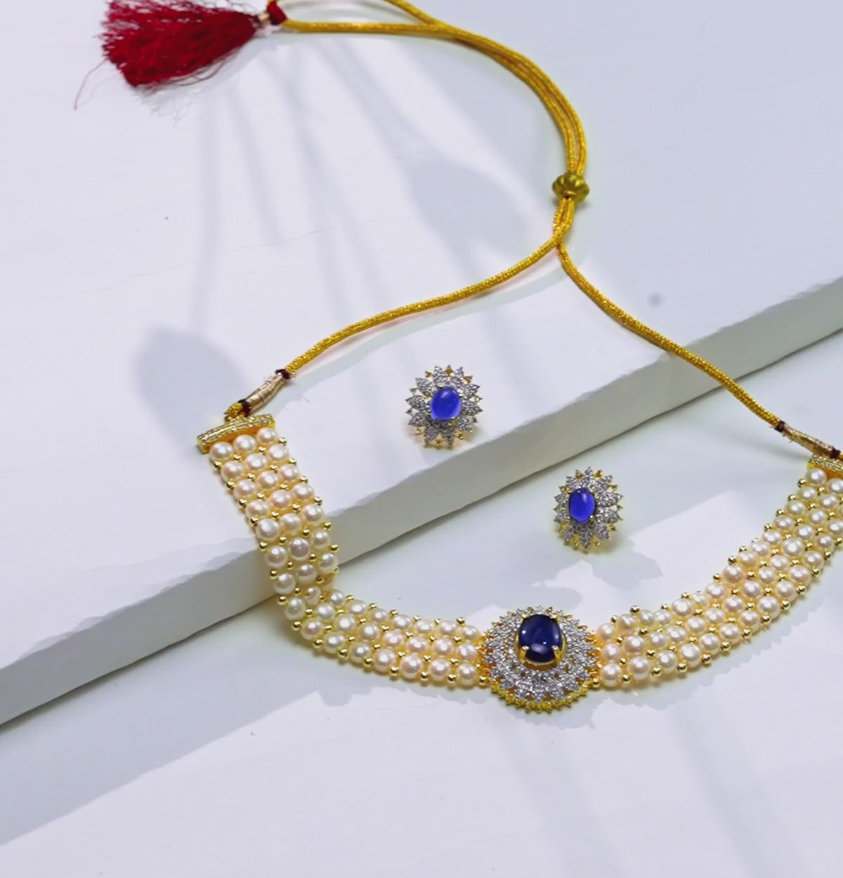 Make a bold statement with this elegant 3-row choker crafted from A-grade freshwater cultured pearls in a stylish button fancy shape. Featuring radiant white pearls sized 4-5mm and accented with a striking blue stone, this 10-inch design offers a perfect blend of grace and glamour. Secured with a lifelong pearl guarantee, it promises enduring charm and quality. Ideal for weddings, cocktail parties, or festive events, this versatile choker complements sarees, lehengas, and fusion wear, adding a sophisticated edge to your ensemble.