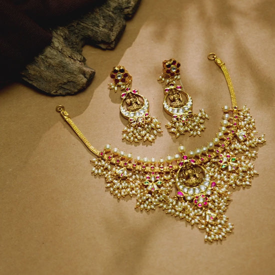Enquire Now On WhatsAppDiscover timeless grandeur with our Detailed Kundan Gutta Pusalu Necklace Set, a masterpiece that blends intricate artistry with regal charm. Adorned with radiant kundan stones and cascading guttapusalu pearls, this set reflects cultural richness and sophistication. Every detail is meticulously crafted, showcasing heritage-inspired elegance and unmatched craftsmanship. Complete with matching earrings, it offers a graceful and luxurious look, making it a treasured heirloom for generations. Designed to symbolize devotion, prosperity, and tradition, this set is perfect for women who value classic elegance.
