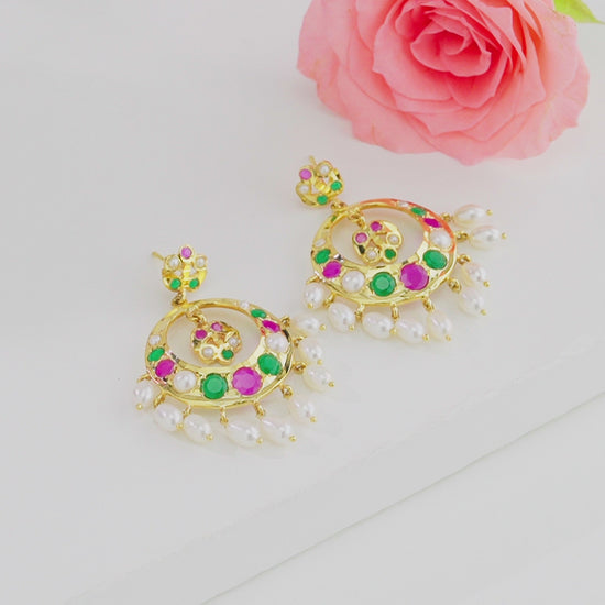 Dramatic Multicolor Drop Pearl Chand Bali is an enchanting creation that beautifully blends tradition with artistic flair. Crafted with Freshwater Cultured Pearls of A-grade quality, it features mixed-shaped white pearls sized 6-7 MM, radiating natural elegance. The multicolor detailing enhances its charm, while the lifelong guarantee on pearls ensures lasting value and authenticity. Its intricate design exudes sophistication, making it a timeless addition to your jewelry collection. Perfect for weddings, festive gatherings, cultural celebrations, or parties, this Chand Bali pairs effortlessly with traditional attire, adding drama, grace, and a regal touch to your overall look.