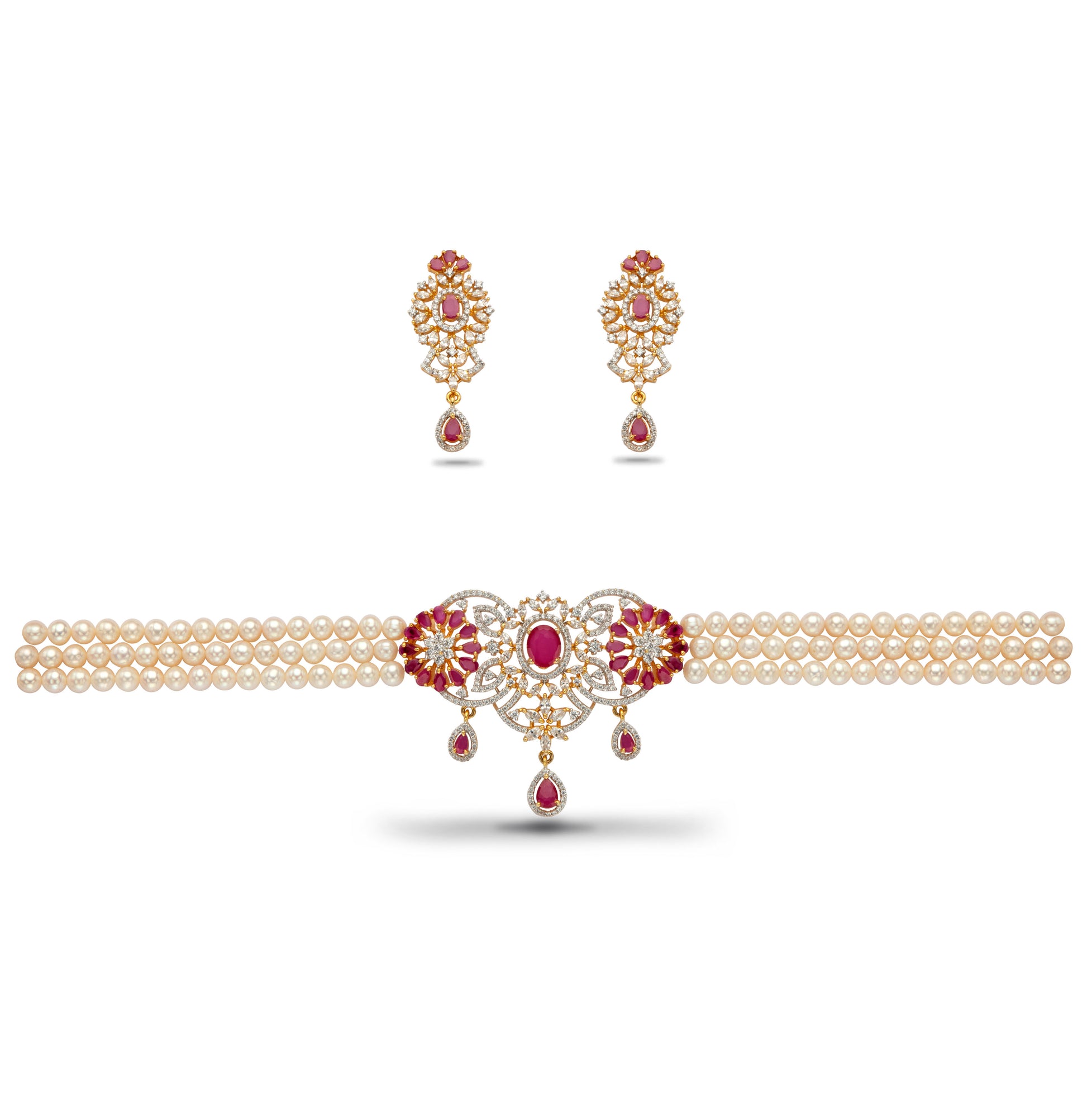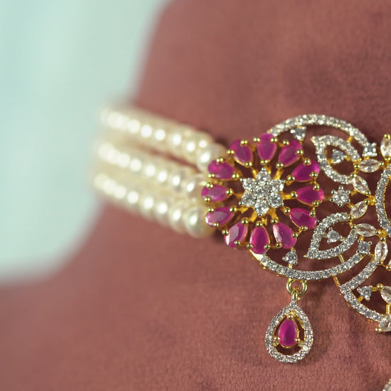 Make a striking impression with this graceful Freshwater Cultured Pearl Choker, featuring 3 rows of radiant 4–5 mm white button pearls of A quality. Designed with a snug 10-inch fit, this elegant piece is accentuated by a bold red stone, offering a stunning contrast and refined charm. Backed by a life-long guarantee on pearls, it promises both luxury and longevity. Perfect for festive occasions, traditional ceremonies, or evening events, this choker pairs beautifully with ethnic wear like sarees and lehengas, as well as fusion outfits, adding richness and allure to your ensemble.