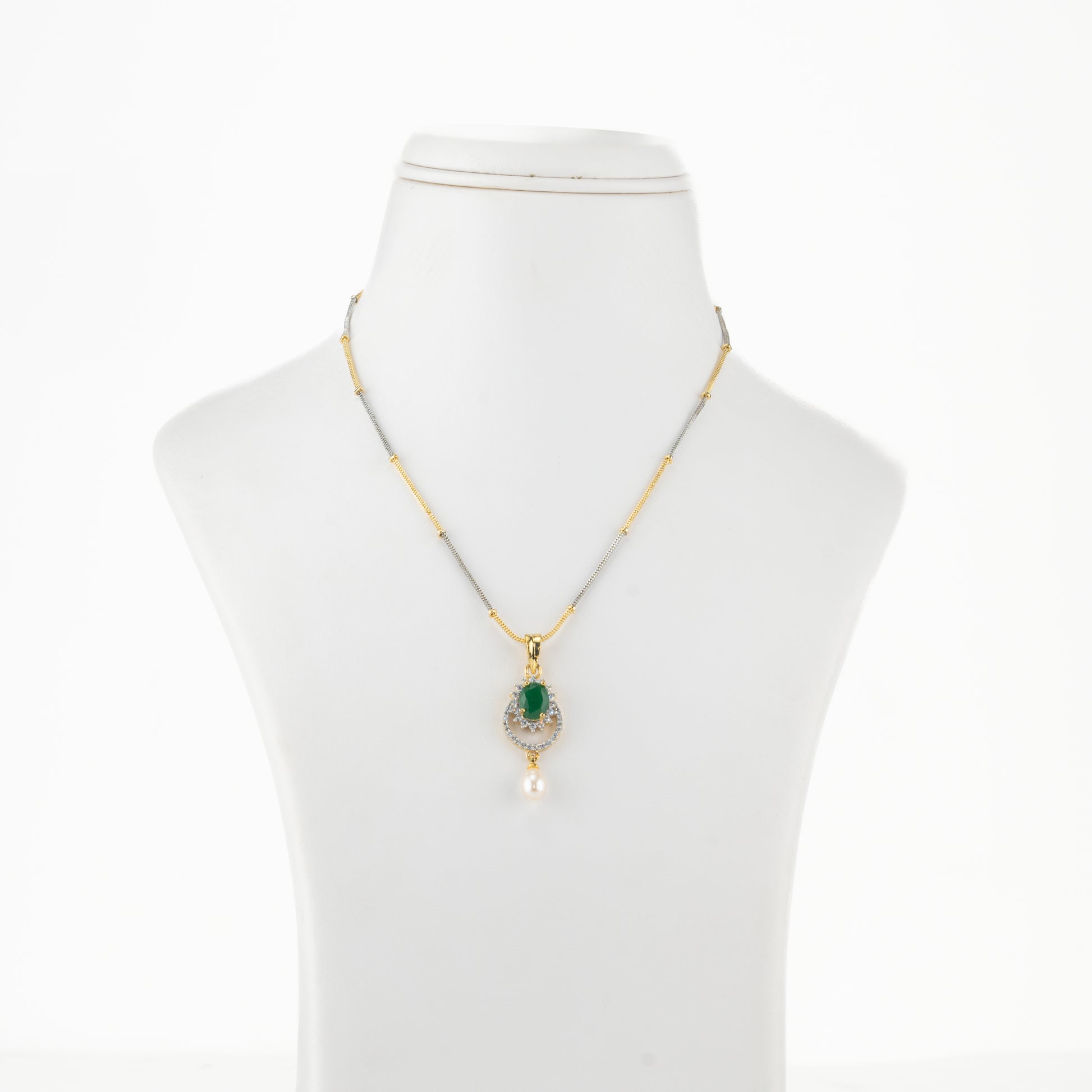 This exquisite necklace is crafted with Freshwater Cultured Pearls in an elegant drop shape and lustrous white color. Designed with a single row, 16-inch length, it features a striking green stone pendant that adds a bold touch of sophistication. Made with A-quality pearls and backed by a life-long guarantee, it blends timeless charm with enduring quality.