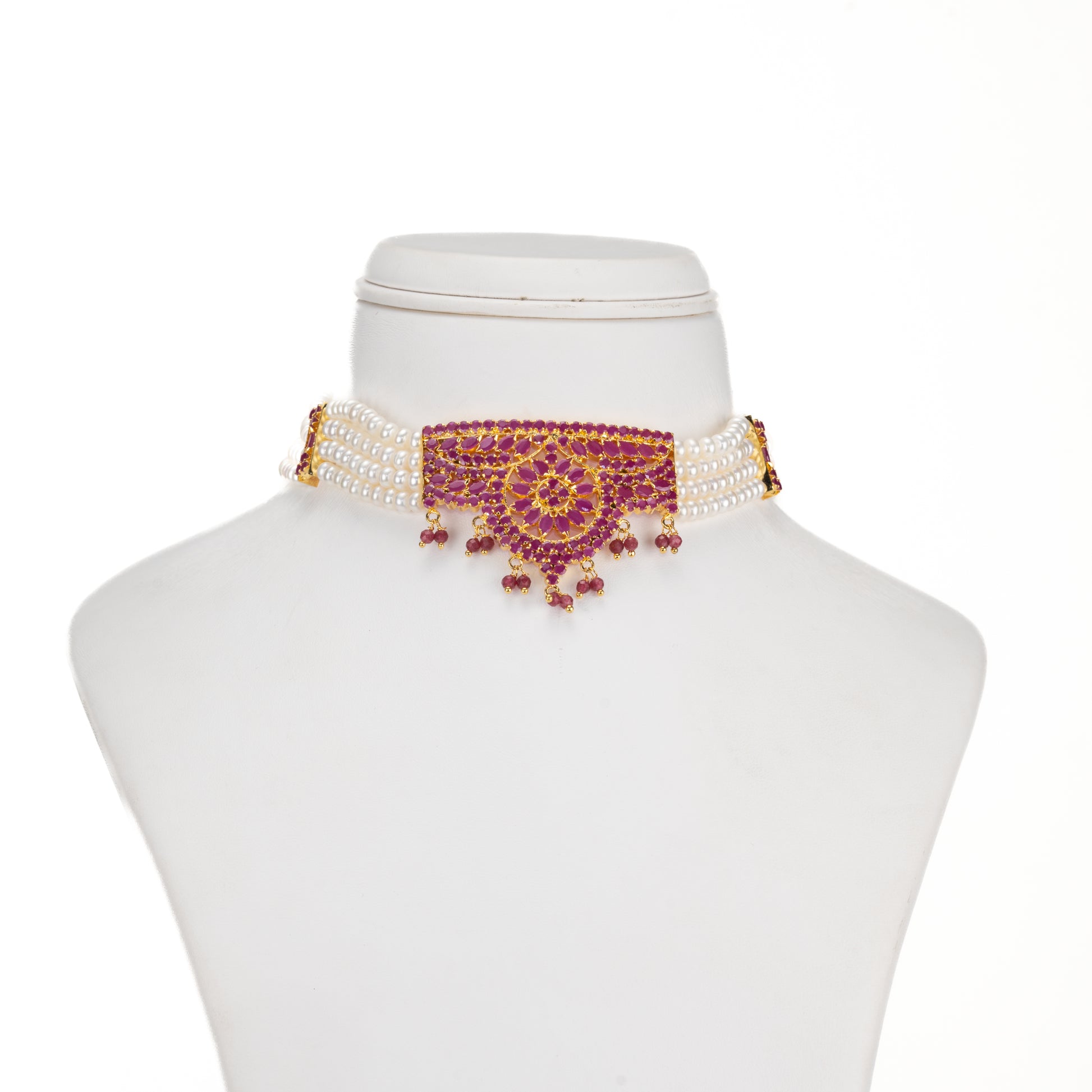 This stylish choker necklace is crafted with 3-4MM white button freshwater cultured pearls of A quality, beautifully arranged in four rows over a 10-inch length for a snug, graceful fit. A striking red stone accent enhances its beauty, giving the piece a touch of regal charm. Backed by a life-long guarantee on pearls, this choker is perfect for weddings, festive occasions, or evening gatherings. Designed to complement both traditional attire and modern outfits, it adds sophistication and elegance to any look.