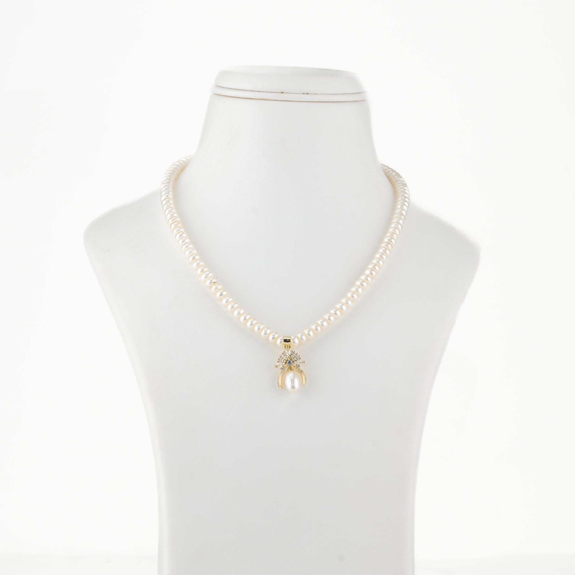 This elegant necklace is strung with 3-4MM white button freshwater cultured pearls of A quality, arranged in a single 16-inch row. The highlight is a graceful single kundan pendant with a white stone, adding a refined touch of traditional charm to the timeless pearl design. Backed by a life-long guarantee on pearls, this necklace is a versatile piece, perfect for festive occasions, weddings, and cultural celebrations. It pairs beautifully with ethnic wear as well as contemporary outfits for a graceful statement look.