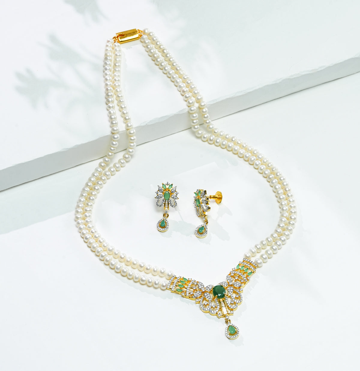 Add a touch of refined elegance to your jewelry collection with this stunning U-shape pendant necklace. Expertly crafted from freshwater cultured pearls, it features lustrous white button pearls sized 4-5 mm with AA quality. The double-row design is complemented by a captivating green stone centerpiece, making it a unique blend of classic and contemporary style. Measuring 18 inches and backed by a lifelong pearl guarantee, this necklace is an everlasting symbol of grace. Ideal for weddings, festive celebrations, or evening gatherings — pair it with sarees, ethnic wear, or modern dresses to create a timeless, sophisticated look.