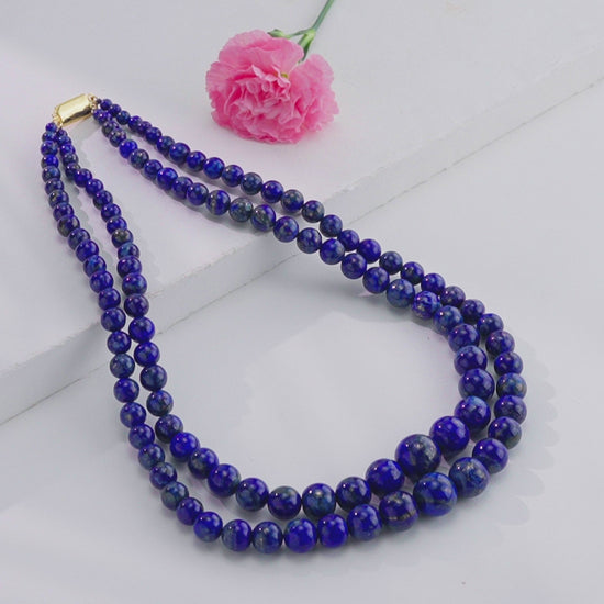 The stones in this necklace appear to be Lapis Lazuli — a deep royal blue semi-precious stone often flecked with tiny golden or white inclusions (pyrite or calcite). Known for its rich color and timeless beauty, Lapis Lazuli has been prized since ancient times.