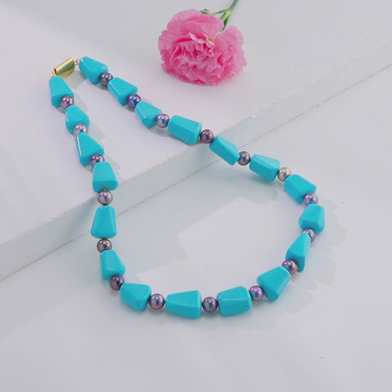 A captivating fusion of elegance and artistry, this necklace features vibrant light Blue semi-precious beads paired with lustrous black freshwater cultured pearls. The serene turquoise hue of Blue beautifully contrasts with the deep, mysterious glow of black pearls, creating a design that radiates sophistication and balance.
