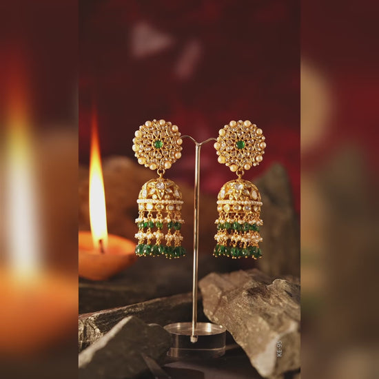 Enquire Now On WhatsAppMake a regal statement with this Gold Pearl Large Kundan Jhumka, exquisitely designed with intricate kundan detailing, a radiant gold finish, and adorned with shimmering pearls. Its large bell-shaped silhouette reflects heritage artistry and timeless charm, making it a true masterpiece. Despite its grandeur, the design ensures comfort, allowing you to wear it with ease and elegance. A perfect blend of tradition and sophistication, this jhumka is a must-have for every jewelry collection. Ideal for weddings, festive occasions, and cultural gatherings, it pairs beautifully with sarees, lehengas, and other ethnic attire, adding unmatched elegance to your ensemble.