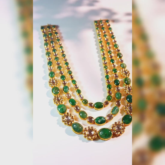 Enquire Now On WhatsAppDazzle in sophistication with our Gorgeous Uncut Diamond Emerald Necklace, a radiant fusion of raw brilliance and regal charm. Featuring sparkling uncut diamonds and lush green emeralds, this masterpiece showcases exceptional craftsmanship and timeless elegance. The uncut diamonds exude natural sparkle, while the emeralds symbolize prosperity and grace, creating a captivating contrast. Designed with intricate detailing, it reflects both tradition and luxury, making it a prized heirloom for generations.