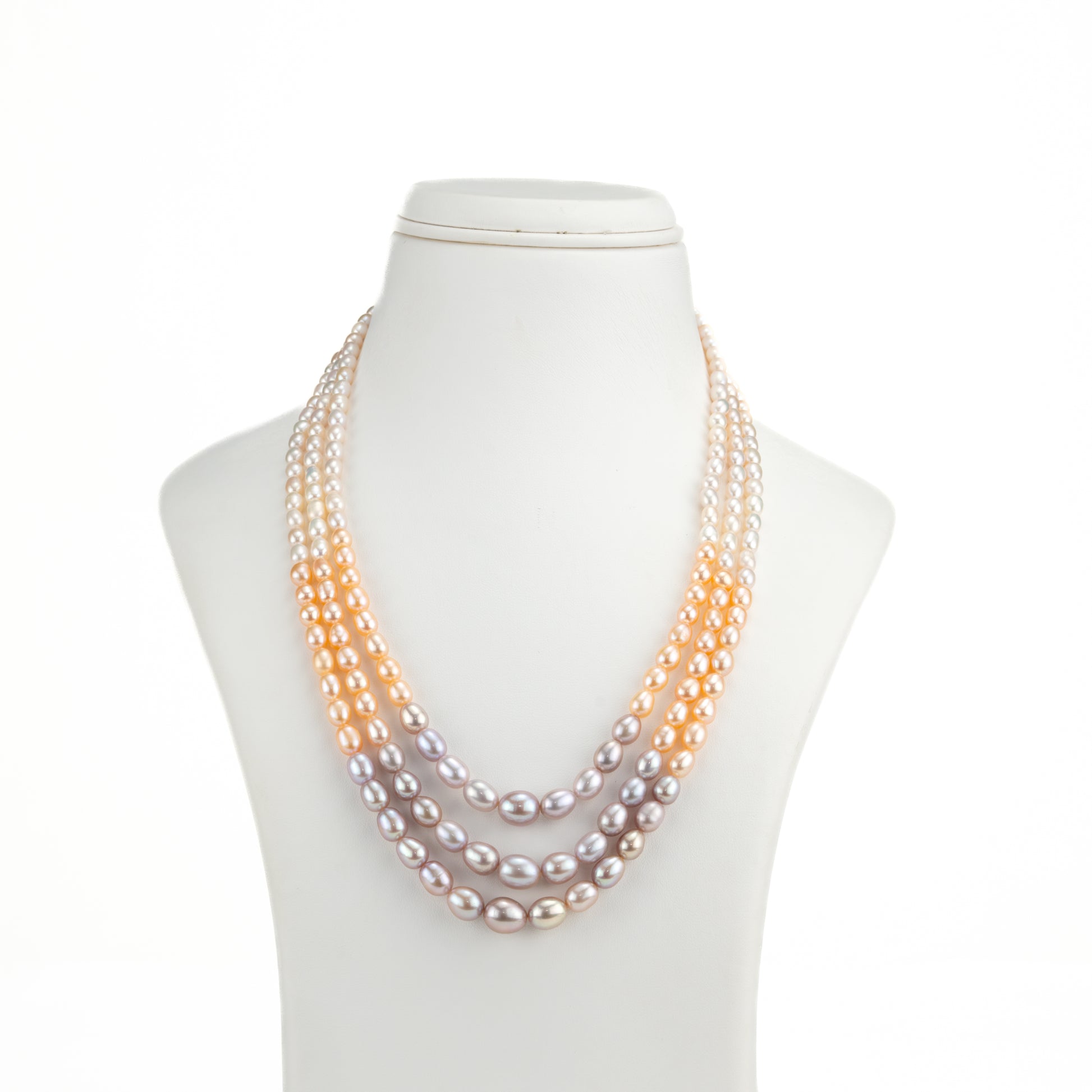 features a breathtaking Freshwater Cultured Pearl necklace crafted with luminous rainbow-hued drop-shaped pearls of AAA quality. Designed with three graceful rows, this necklace is 18 inches long and weighs approximately 61.5 grams, giving it a bold and luxurious appeal. The vibrant rainbow tones enhance its beauty, making it a statement piece of timeless elegance. Backed by a life-long guarantee on pearls, this necklace is a true treasure. Perfect for grand occasions, weddings, and festive celebrations, it effortlessly elevates both traditional ensembles and modern attire with radiant charm.