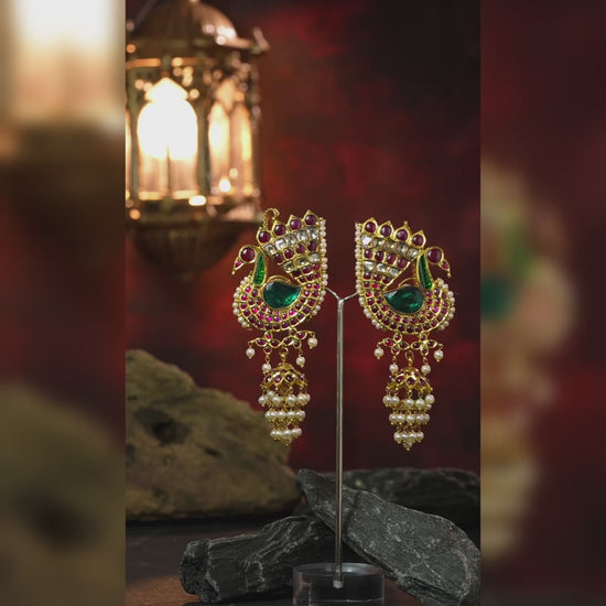 Enquire Now On WhatsAppThe Kundan Gold Peacock Jhumka Earrings are a breathtaking fusion of artistry and tradition, showcasing the majestic beauty of the peacock. Crafted in gold, these earrings are adorned with intricate kundan work, radiant rubies, sparkling stones, and rich green accents that bring the peacock design to life. Dangling pearls add a graceful finish, enhancing their regal charm. Exuding elegance and grandeur, these earrings are a true statement piece for any jewelry collection. Perfect for weddings, festive occasions, and cultural celebrations, they pair beautifully with sarees, lehengas, and anarkalis, adding royal allure and sophistication to your ensemble.