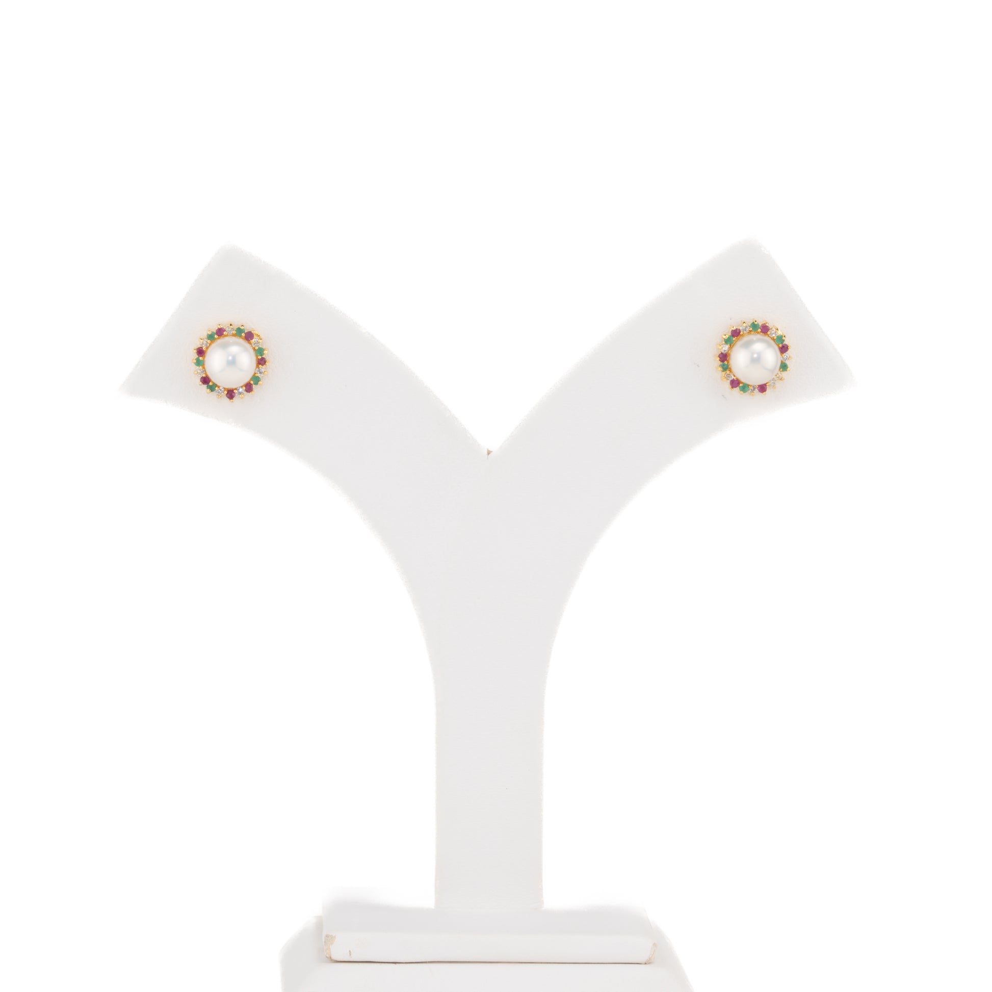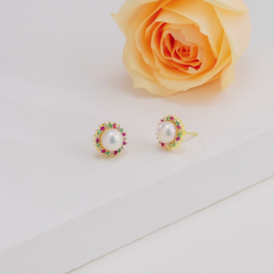 Enhance your jewelry collection with these Modern Red Green Pearl Stud Earrings, designed with 7-8MM button-shaped white freshwater cultured pearls of A quality. The radiant pearls are beautifully paired with red and green stones, creating a stylish and versatile accessory. Backed by our Life Long Guarantee on Pearls, these earrings are perfect for festive occasions, cultural gatherings, or adding a modern twist to your everyday elegance.