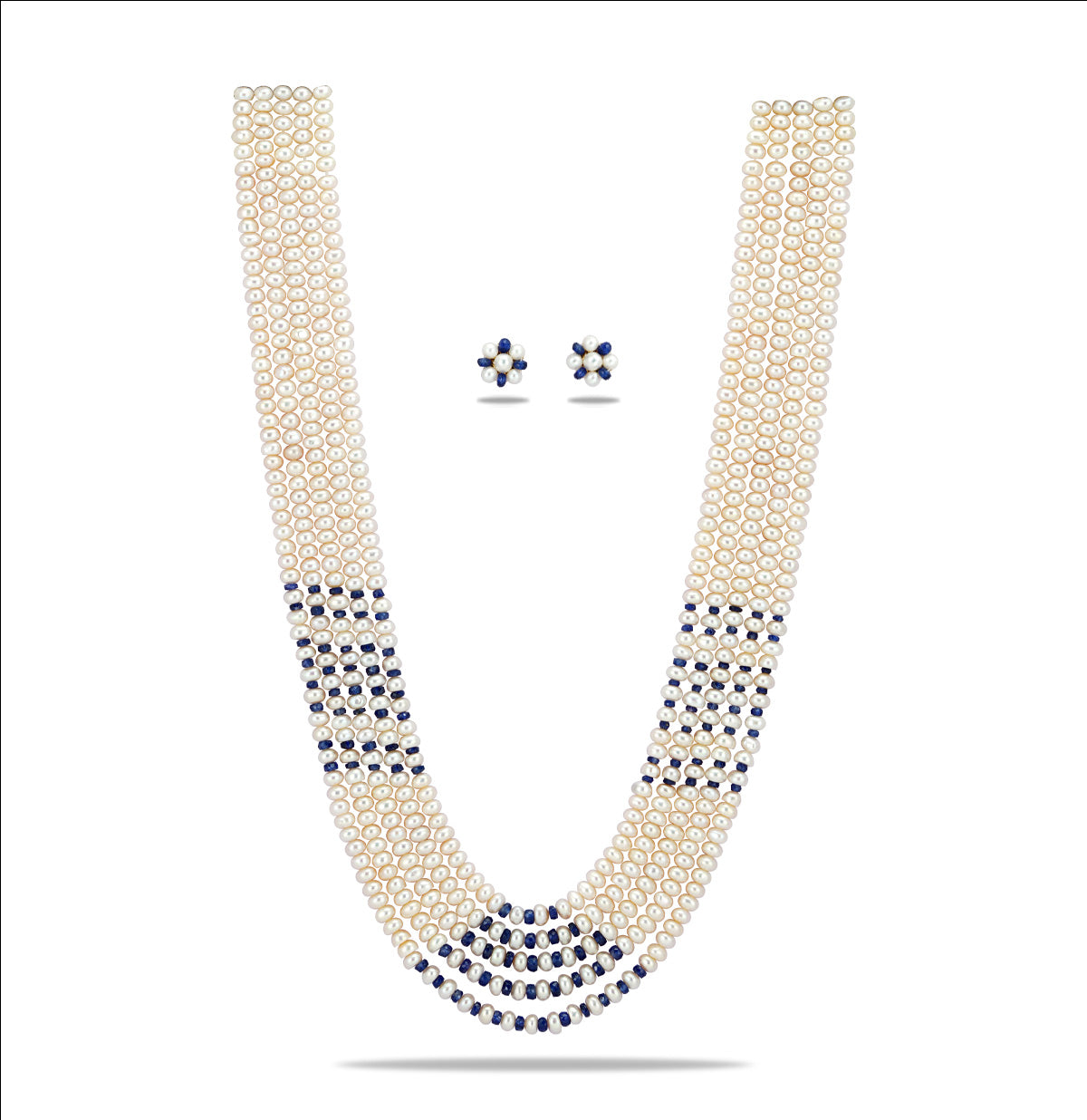 Discover timeless elegance with this 5-row necklace featuring AAA-quality freshwater cultured white button pearls, beautifully paired with cut-faceted natural blue sapphires. Measuring 18 inches and weighing approximately 110.75 grams, the 3–4 mm pearls lend a refined charm to this handcrafted piece. The striking blue gemstones add a regal accent, while the lifelong guarantee on pearls and natural stones ensures lasting value. Ideal for weddings, festive gatherings, or formal evenings, this necklace complements ethnic outfits and sophisticated attire with effortless grace.