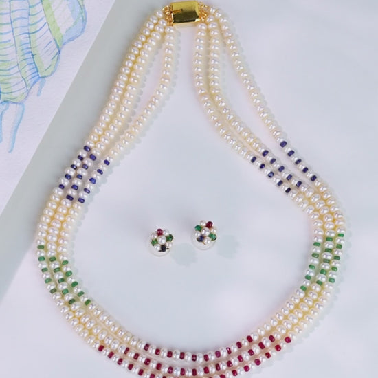 Natural Mix Ruby, Sapphire & Emerald with Freshwater Pearl Necklace Set is an elegant masterpiece crafted to perfection. Featuring lustrous 5-6 MM white button pearls of AA quality, this 3-row 18-inch necklace is beautifully enhanced with natural ruby, emerald, and blue sapphire stones. With a combined pearl weight of approximately 64.1 grams, it radiates richness and grace. Backed by a lifelong guarantee on both pearls and natural stones, this set promises timeless value and authenticity. Perfect for weddings, festive occasions, parties, or cultural gatherings, it complements both ethnic and modern attire, adding sophistication and vibrant charm to your look.
