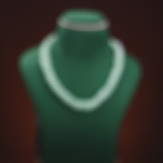 Grace your neckline with the necklace, featuring AAA-grade freshwater cultured pearls in a classic round shape. With 10 elegant rows of 1–2 mm white pearls, this 18-inch piece weighs approximately 57.6 grams and is adorned with natural cut-faceted emerald stones in a rich green hue. Designed with enduring beauty and backed by a lifelong guarantee on pearls and stones, this necklace blends timeless elegance with vibrant sophistication. Ideal for festive gatherings, traditional ceremonies, or formal occasions, it complements sarees, lehengas, and even Indo-western ensembles with a refined and regal touch.