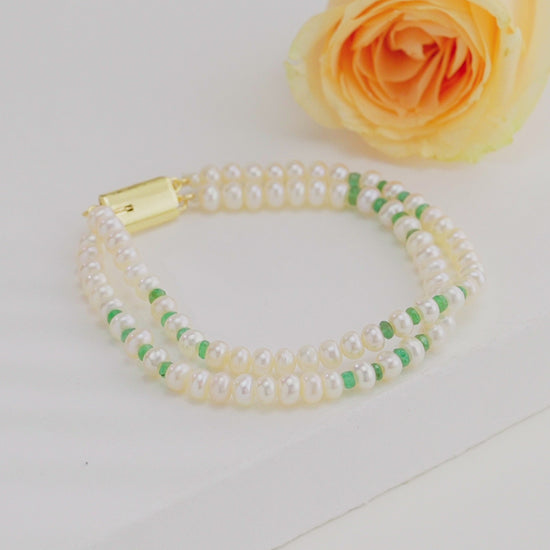 Elevate your elegance with this Natural Emerald White Button Pearl Bracelet, beautifully crafted with Freshwater Cultured Pearls and genuine green emeralds. The two rows of radiant 5–6 mm white button pearls create a graceful contrast against the vivid green gemstones, adding a touch of sophistication to any look. Weighing approximately 13.5 grams and measuring 7 inches in length, this bracelet offers a comfortable and refined fit. Designed in AA quality, it comes with a Life Long Guarantee on Pearls, making it a perfect blend of luxury and timeless charm—ideal for festive wear, traditional occasions, or elegant evening ensembles.