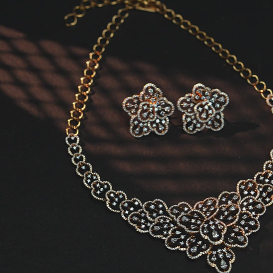 Enquire Now On WhatsAppThe Pristine Diamond Necklace Set is a dazzling masterpiece designed to capture timeless elegance and modern sophistication. Expertly crafted with sparkling diamonds, this set features a beautifully detailed necklace paired with matching earrings, creating a harmonious blend of luxury and grace. Its radiant brilliance and intricate craftsmanship make it a statement addition to your jewelry collection. Perfect for brides, festive occasions, and grand celebrations, this diamond set enhances every outfit, from traditional attire to contemporary ensembles, with unmatched charm and elegance. An exquisite choice to elevate your style at weddings, parties, or evening gatherings.
