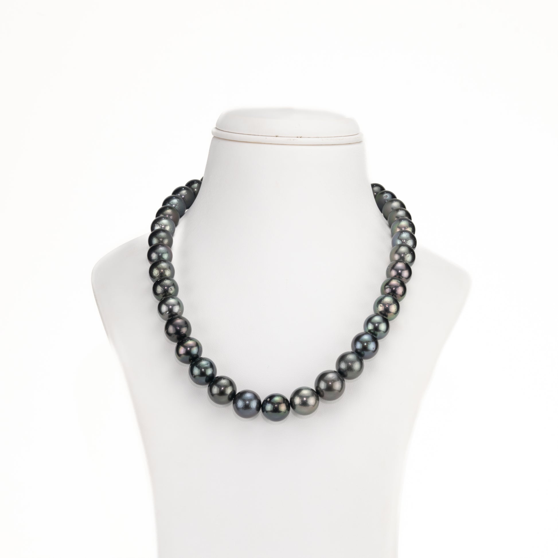 Elevate your elegance with this exquisite 12.0–13.0mm Black Tahitian Round Saltwater Pearl Necklace Set (AA Quality). Crafted from South Sea cultured pearls, each round pearl radiates a deep, captivating luster in striking shades of natural black and grey overtones. The generous 18-inch single strand showcases perfectly matched pearls, exuding timeless sophistication and luxury. With an approximate total weight of 540 carats, this necklace embodies premium craftsmanship and natural allure.