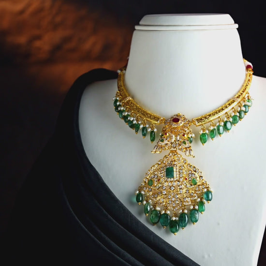 Enquire Now On WhatsAppIntroducing the Royal Stone Emerald Ruby Necklace Set, a majestic blend of luxury and elegance. Featuring vibrant emeralds and dazzling rubies meticulously set in luxurious gold, this set showcases exceptional craftsmanship and a regal, eye-catching design. Each gemstone is carefully arranged to create a harmonious and sophisticated look that enhances any jewellery collection. Lightweight and comfortable, it rests gracefully along the neckline, offering both style and ease of wear. Perfect for weddings, festive celebrations, or grand occasions, this necklace set pairs beautifully with traditional sarees, lehengas, and contemporary ensembles alike, adding a touch of royal charm and refined elegance to elevate your attire.