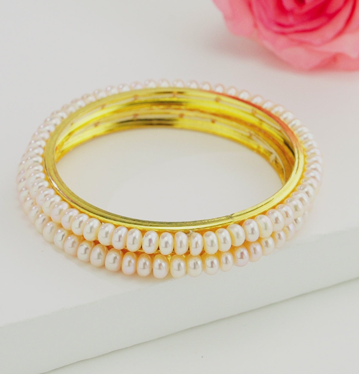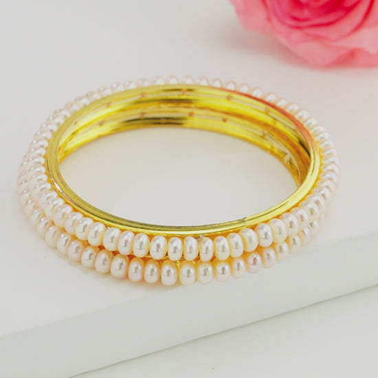 Adorn your wrist with the delicate charm of this Pink Freshwater Pearl Bangle, crafted with lustrous AA quality button pearls in a soft pink hue. Featuring 3–4 MM pearls arranged in a single elegant row, this bangle is available in 2.6 size, ensuring a comfortable and graceful fit. Its timeless design makes it a versatile accessory for both daily wear and special occasions. Backed by a Life Long Guarantee on Pearls, this bangle blends sophistication with lasting beauty—perfect for complementing ethnic attire, festive celebrations, or modern ensembles.