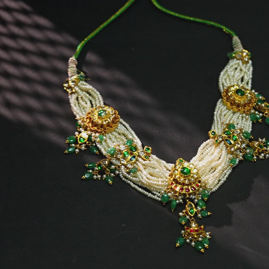 Enquire Now On WhatsAppElevate your elegance with this Textured Kundan Uncut Diamond Pearl Emerald Choker, a stunning blend of traditional craftsmanship and modern allure. Featuring meticulously set uncut diamonds and lustrous pearls, accented with vibrant emeralds, this piece exudes royal charm. The intricate Kundan work adds depth and texture, making it a true statement of luxury. Crafted for both beauty and comfort, it sits gracefully around the neck, reflecting light from every angle. Perfect for weddings, festive celebrations, or special soirées, this choker pairs effortlessly with ethnic wear or contemporary ensembles, adding a regal touch to any attire.