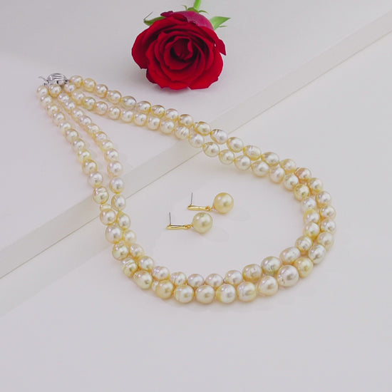 This exquisite necklace set features radiant 10–11mm golden drop-shaped South Sea pearls, admired for their rich color and lustrous glow. Crafted in a timeless Two-row, 18-inch design, it showcases A-quality saltwater cultured pearls weighing approximately 606.25 carats, offering exceptional elegance and presence. Each pearl is hand-selected for its smooth surface, symmetry, and natural sheen. The set comes with a Life Long Guarantee on Pearls and a Certificate of Authenticity, ensuring 100% genuine quality.