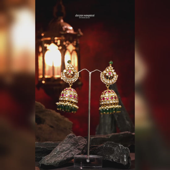 Enquire Now On WhatsAppThe Trendy Kundan Gold Ruby Jhumka is an exquisite piece of traditional artistry, crafted with intricate detailing in gold and embellished with sparkling kundan and vibrant ruby stones. The dome-shaped jhumka is adorned with a harmonious blend of red rubies, clear kundan work, and delicate pearls, finished with striking green bead drops for added elegance. Its luxurious design radiates timeless charm, making it a true statement accessory. Perfect for weddings, festive occasions, and grand celebrations, this Jhumka pairs beautifully with ethnic sarees, lehengas, and Anarkali's, elevating your look with a royal and graceful touch.