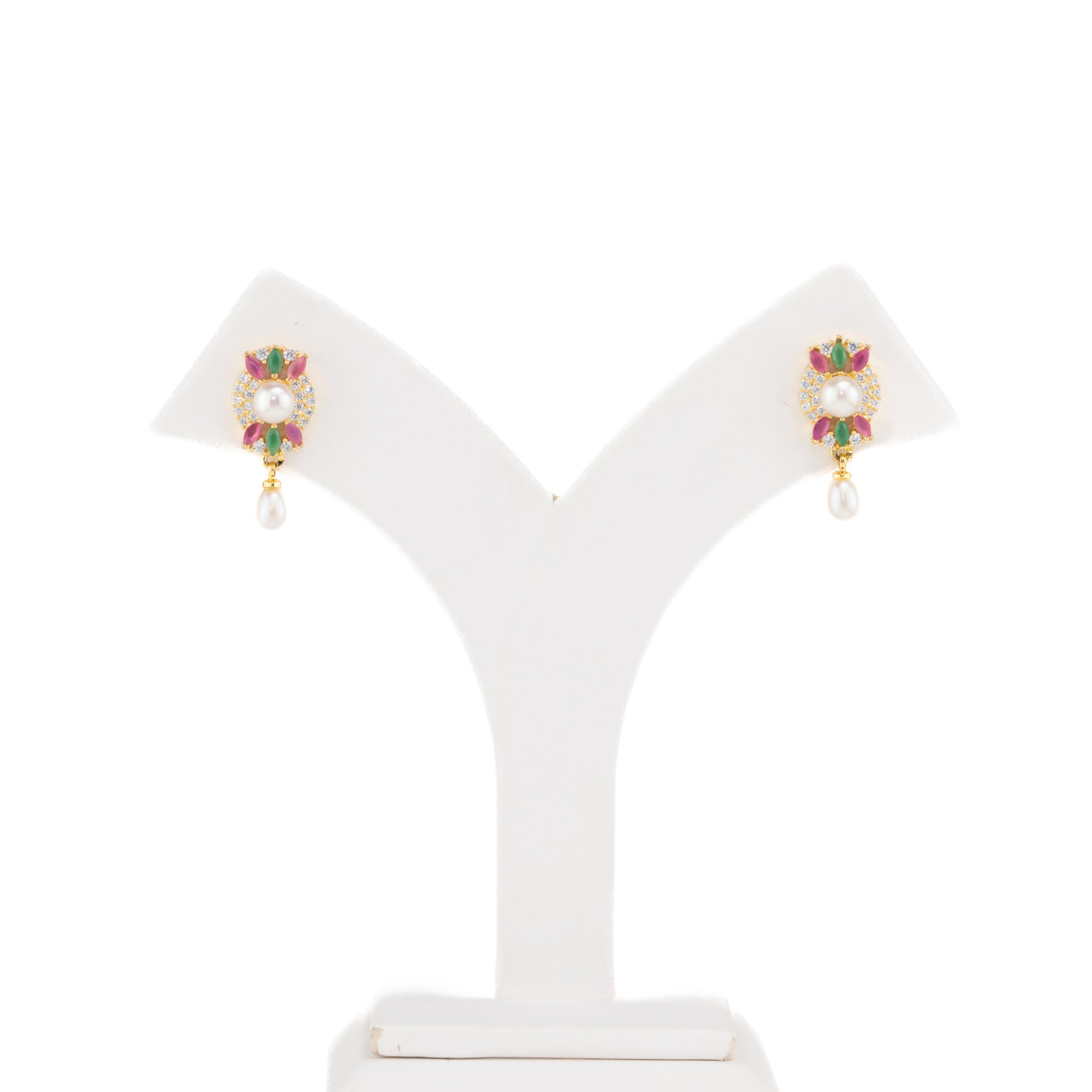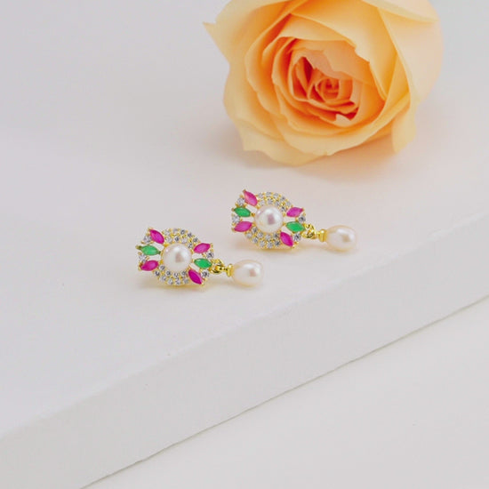 Twinkling Red Green Mix Hanging Pearl Studs Earrings