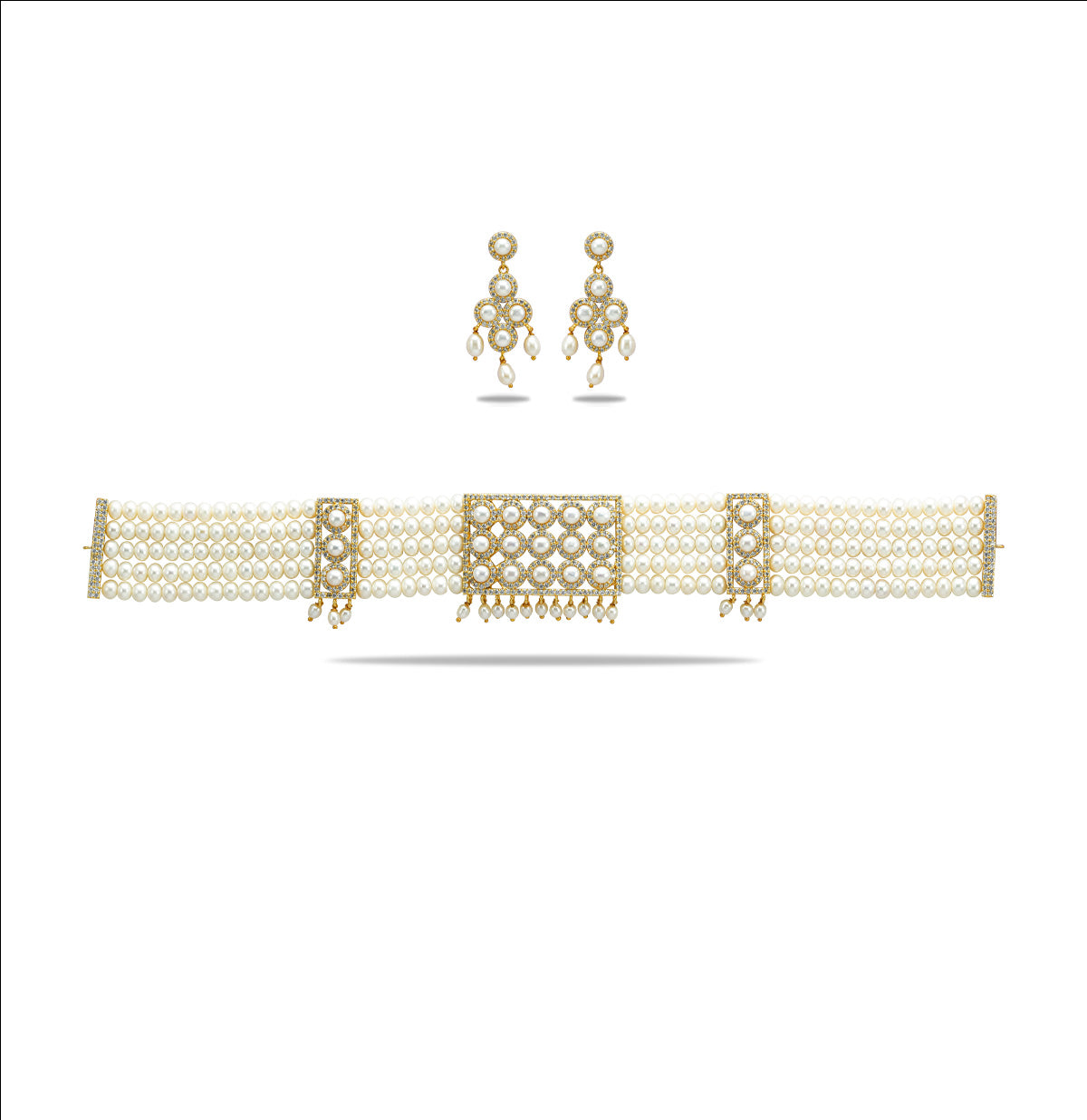 Make a bold style statement with this luxurious Freshwater Cultured Pearl Choker , designed with 5 rows of radiant white button pearls measuring 3–4 mm. With A pearl quality and a graceful 10-inch length, this choker is adorned with an elegant white stone centerpiece, blending tradition with modern charm. Crafted for comfort and backed by a life-long pearl guarantee, it is a perfect blend of durability and sophistication. Ideal for weddings, cultural events, or festive evenings, this choker pairs beautifully with sarees, lehengas, or evening gowns, adding elegance to any attire.