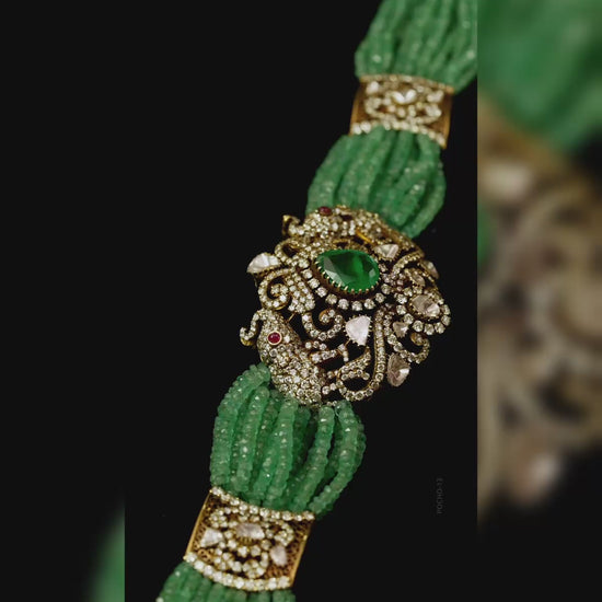 Enquire Now On WhatsAppExude timeless elegance with our Vintage Emerald Beads with Uncut Diamond Choker, a perfect blend of classic charm and luxurious craftsmanship. Featuring rich emerald beads paired with hand-selected uncut diamonds, each stone is meticulously set in a gold-toned framework that enhances its natural brilliance. The intricate design reflects traditional artistry while offering a sophisticated, contemporary appeal. Lightweight and comfortable, it makes a striking statement without compromising on wearability.
